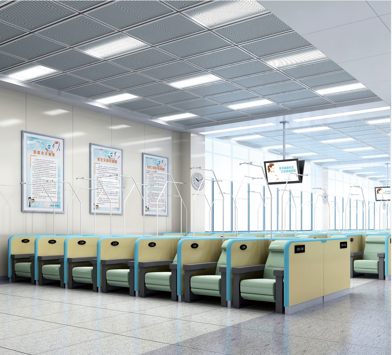 輸液大廳是用于急診、門(mén)診輸液的治療單元,實(shí)際設(shè)計(jì)時(shí)可多元套用,需與皮試月幾注室、護(hù)士站、輸液配劑室臨近。設(shè)計(jì)時(shí)需注意座椅間距,需滿(mǎn)足治療車(chē)通過(guò)、 護(hù)士靜脈注射等操作所需空間。